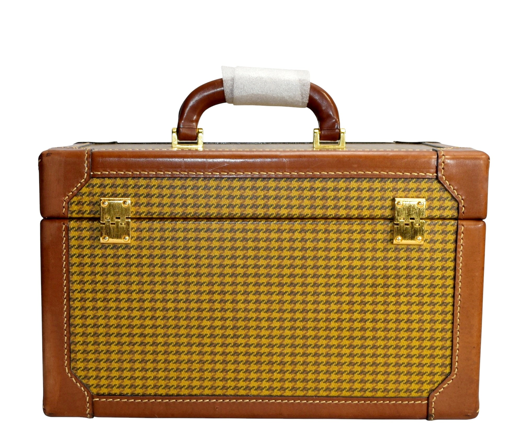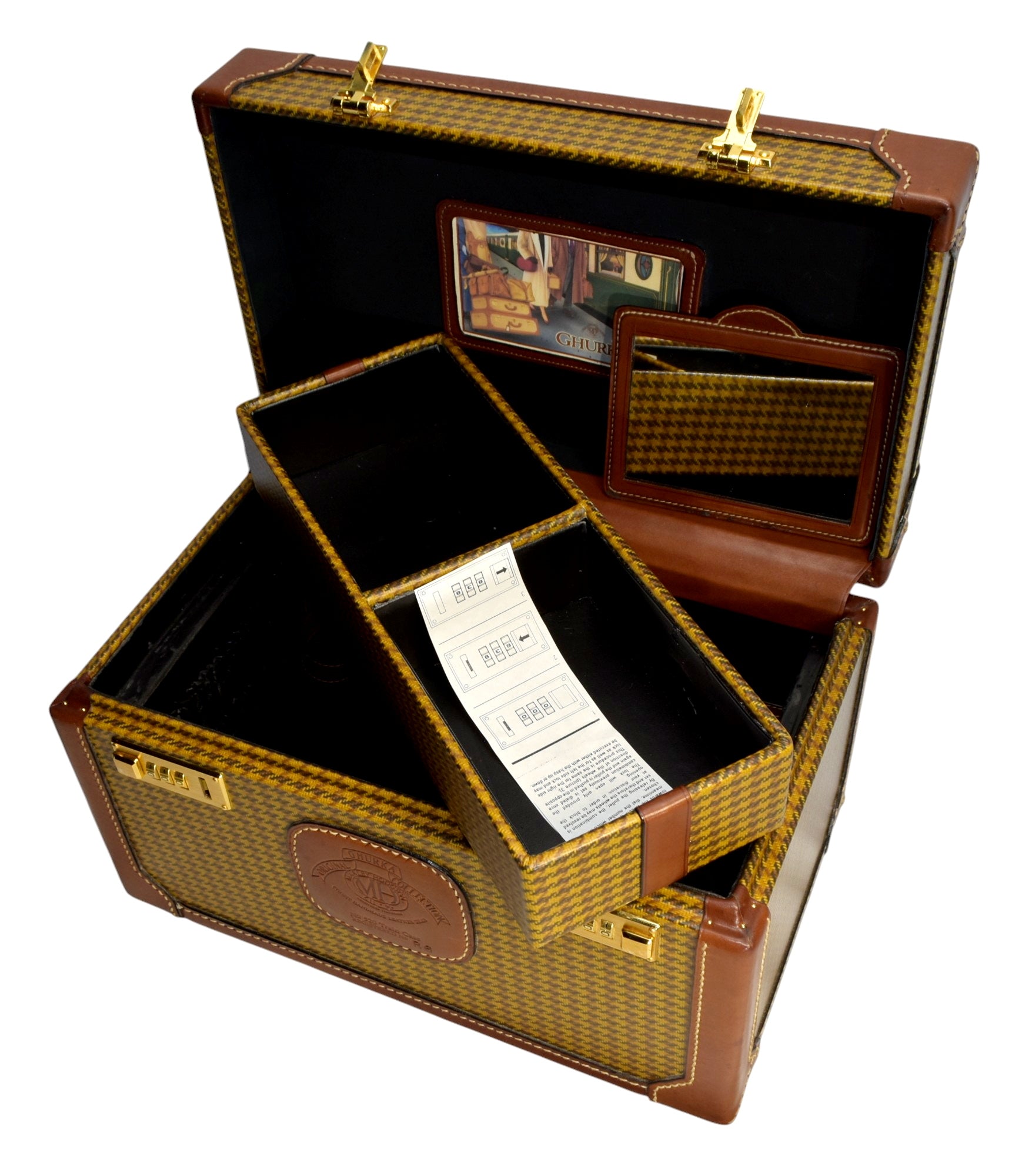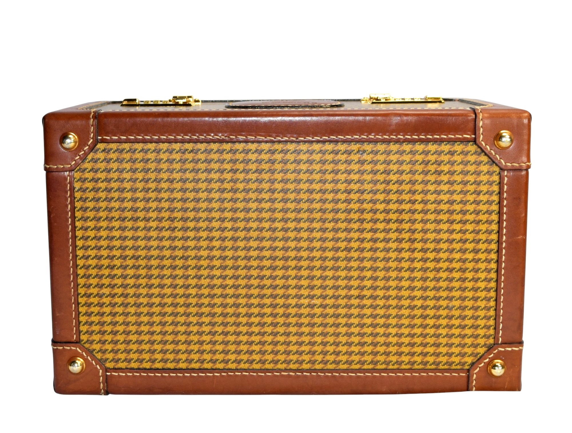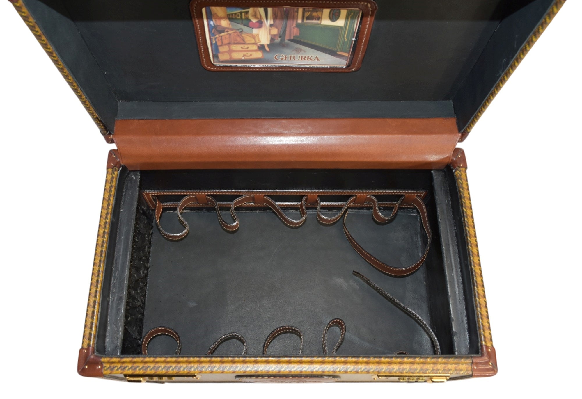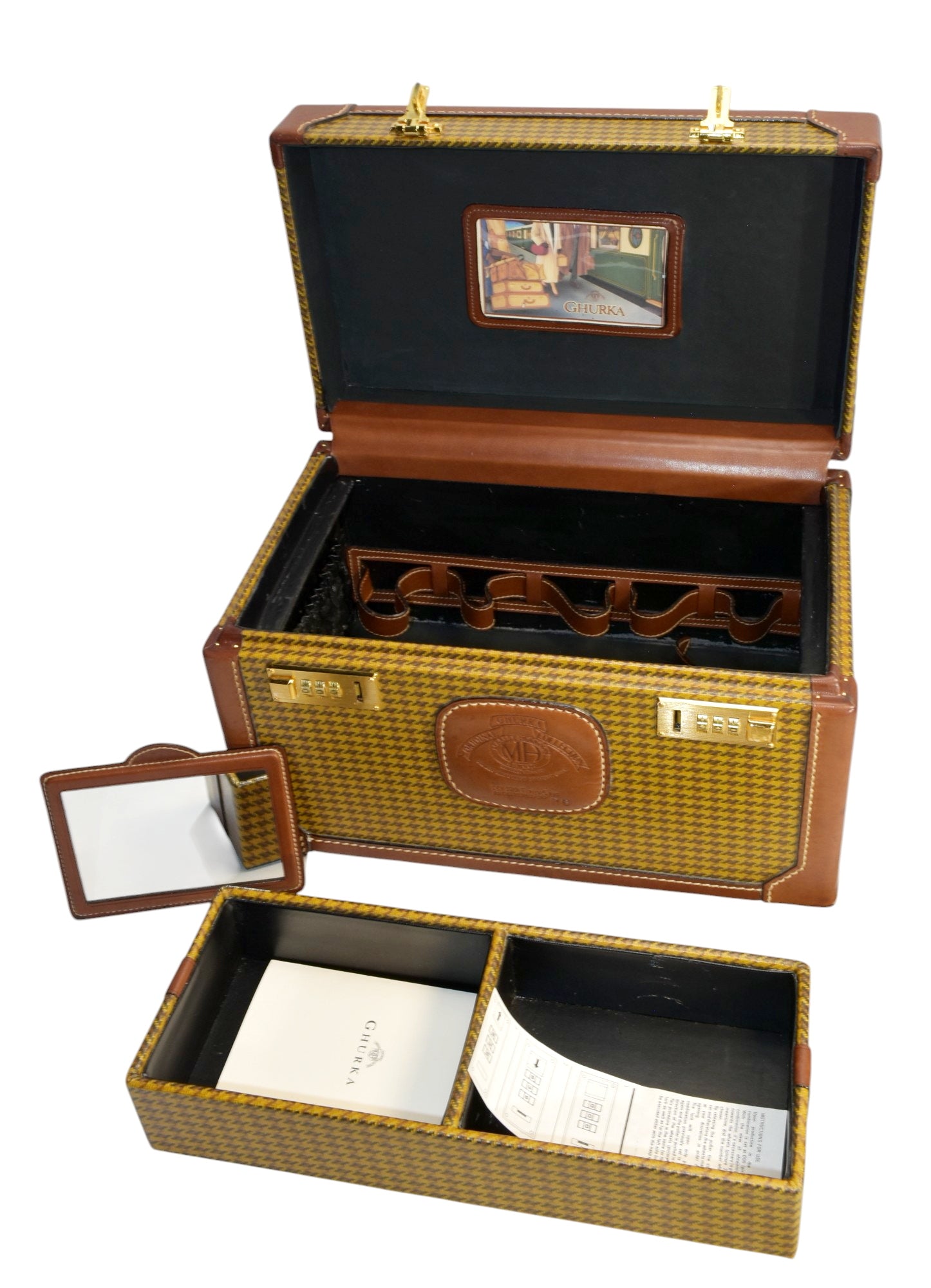 This exquisite Ghurka Train Case is masterfully crafted in leather and twill, cleated and hand-stitched onto tongue-and-groove birch frames with remarkable precision. Produced by special order only, each numbered piece was meticulously made in the Cornaredo workshop in Lombardy, Italy, with only a few completed each month. This example is scarce and remains in outstanding condition.