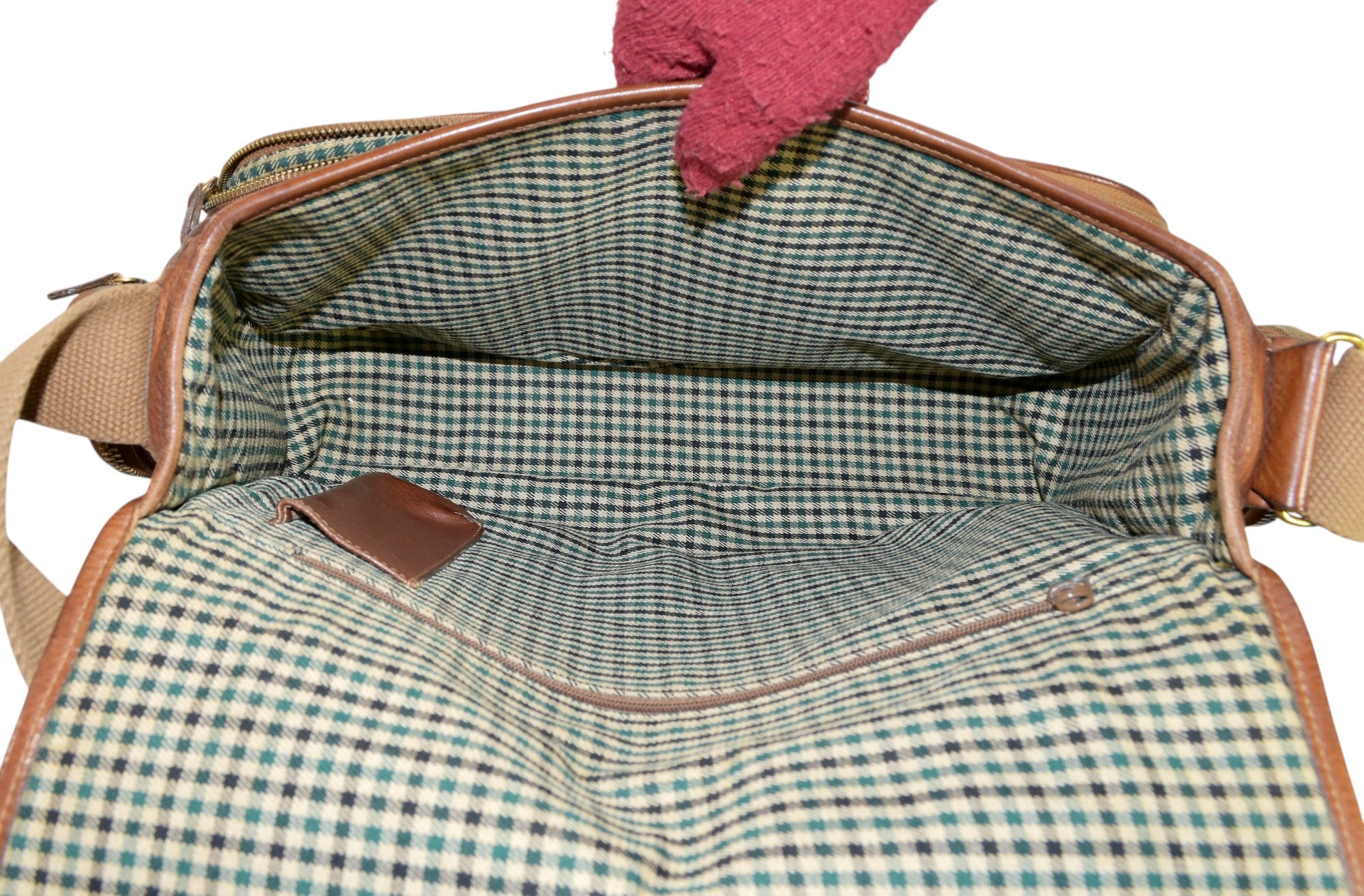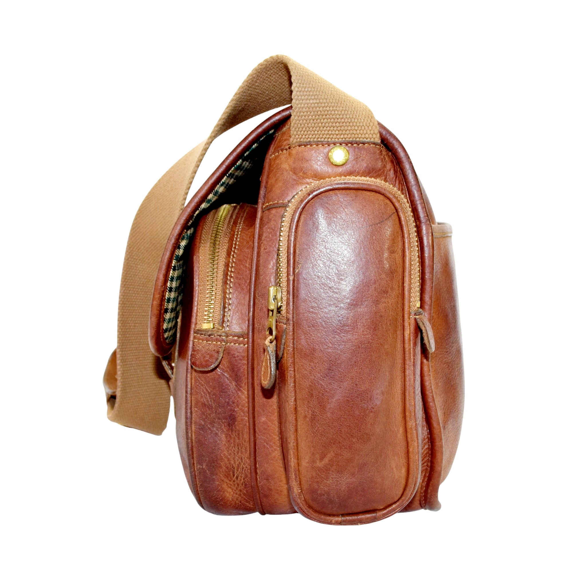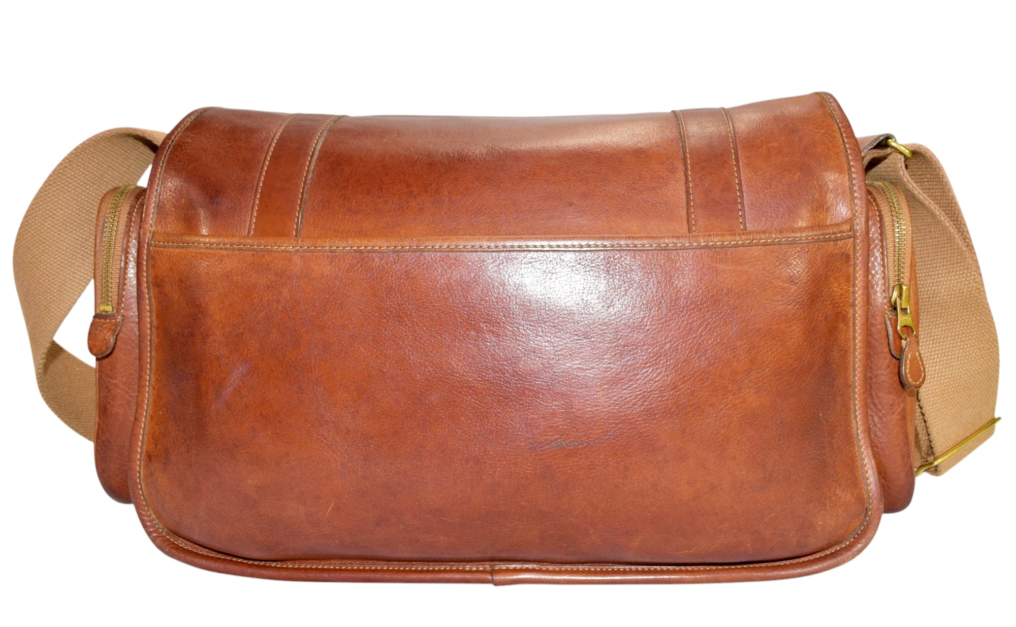 Safari No. 93 reflects the quality that has gone into this Ghurka messenger Bag. The character and functionality can't be missed. Expert craftsmanship is highlighted in this luxurious chestnut vintage Leather 38 cross-body messenger bag. To design this bag, professionals, men, and women who travel frequently and combine or switch activities often, were in mind. The sophisticated structure, roomy main compartment, flap-top closure with two extended zipper pockets in front, a wide-adjusted shoulder strap, extended side pocket, and full-length pocket in back for a small umbrella or newspaper make this brief a versatile option for a remote office. The bag is in fantastic condition and embodies the craftsmanship found in all Ghurka items.